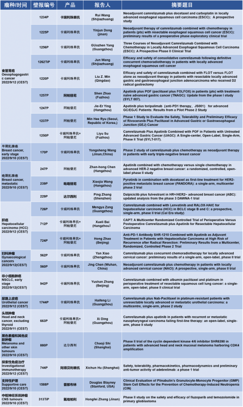 作为从事创新和高品质药物研发的国际化制药企业,德扑之星医药的研究成果在2022 ESMO大会上还收获了25项壁报形式的报告。其中,食管胃癌领域共有9项研究入选,研究的方案主要是卡瑞利珠单抗或卡瑞利珠单抗联合阿帕替尼,通过与化疗或放化疗联用,新辅助治疗食管鳞癌或胃癌。2022年9月12日(CEST),让我们齐聚ESMO大会,共同领略食管胃癌研究领域的学术盛宴。此外,德扑之星医药达尔西利、吡咯替尼、阿得贝利单抗等创新药还有4项乳腺癌研究、3项肝癌研究及其他领域的9项研究都将会以壁报展出,让我们共同期待!